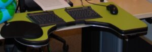 Laat een stalen plank met zachte toplaag op maat maken: Op de juiste locatie een deelbaar toetsenbord (bijvoorbeeld Freestyle SOLO) uitsnijden, hierdoor komen de toetsen op dezelfde hoogte als de bureauplank. Dit voorkomt extra hoogte ná correcte hoogte-instelling hoog/laagbureau. Eventueel gelpads onder armen aanbrengen op “ellebooghoogte” voor extra steun. Hierdoor verminderen nek- en rugbelasting.