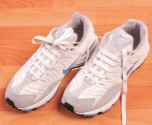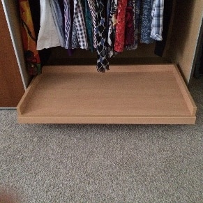 Maak van een plank op rails een uittrekbare bodem in uw kast of halverwege (boven ladenblok) waarop u schoenen kunt zetten die u zonder te bukken of met uw voeten kunt pakken en weer in de kast kunt opbergen. Zorg dat de plank opstaande randen heeft (behalve aan de voorzijde), zodat alles erop blijft staan en er niets achter de plank kan vallen en u tóch met uw voeten de schoenen eraf kunt schuiven of pakken.