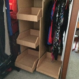 Bij korte armen of een armbeperking: voorkom bukken en duiken in uw kast door in plaats van vaste planken deze op rails te laten maken, of deze bakken (zie foto) voor losse spullen zodat u overal gemakkelijk bij kunt, eventueel ook vanaf de zijkant. In dit voorbeeld ziet u een garderobekast maar ook een werkkast kunt u zo zelf ontwerpen en laten maken.