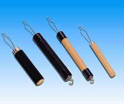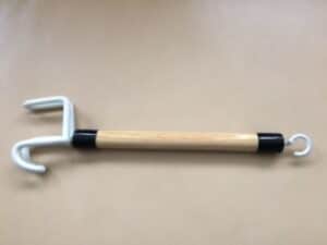 Eigen ontworpen en gemaakte houten stokje (bijvoorbeeld: 32 cm) met haakje aan uiteinde en andere kant een dwarsstokje voor betere grip.