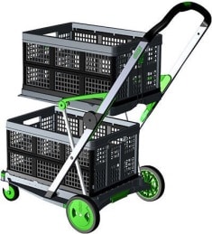 De clevere, multifunctionele CLAX (boodschappen)wagen, volledig inklapbaar met en zonder boodschappenkratten. Het bovenste deel is opklapbaar, dan is het een steekwagen. Ook vol bepakt nog zeer licht te draaien en te duwen door de soepele zwenkwielen.