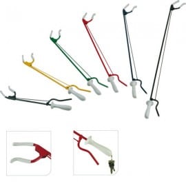 Metalen grijper in diverse lengtes (40-80 cm en 100 cm) en diverse kleuren met rubberen handvat met magneet, eenvoudige hefboom bediening.