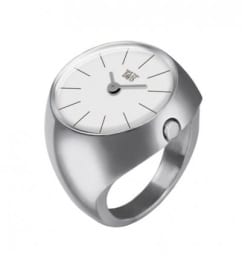 Kleinste formaat horlogekast aan een kleine en dunne ring bevestigd, die in maat (vingerdikte) verstelbaar is. In goudkleur en zilver verkrijgbaar, uurwerk in zwart/wit, verschillende cijfers op wijzerplaat mogelijk (zie website).